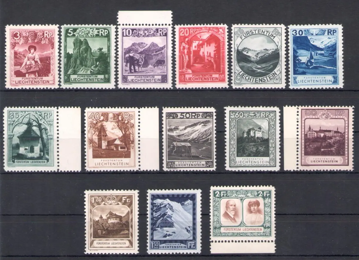 1930 Liechtenstein, Nr. 94-107, Verschiedene Ansichten - Schlösser und Ansichten und Fürsten, 14 Werte, Mischverzahnung - NMH**