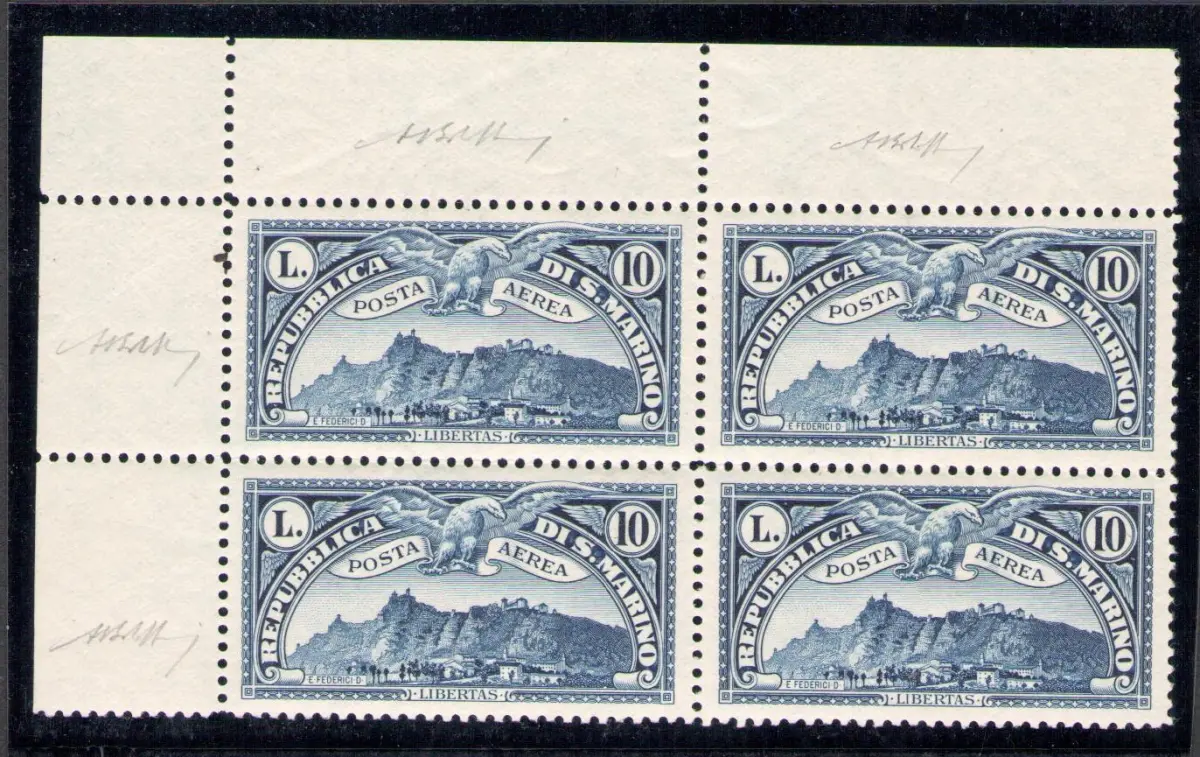 1931 SAN MARINO, PA Nr. 1/10 10 Werte in SELTENEN MNH VIERTELN ** Bolaffi-Signatur und Bolaffi-Zertifikat Unserer Meinung nach ist das Viertel, von dem hier eine fotografische Reproduktion zusammengefügt ist, original, perfekt, gedruckt und in Bolaffi-Qualität.