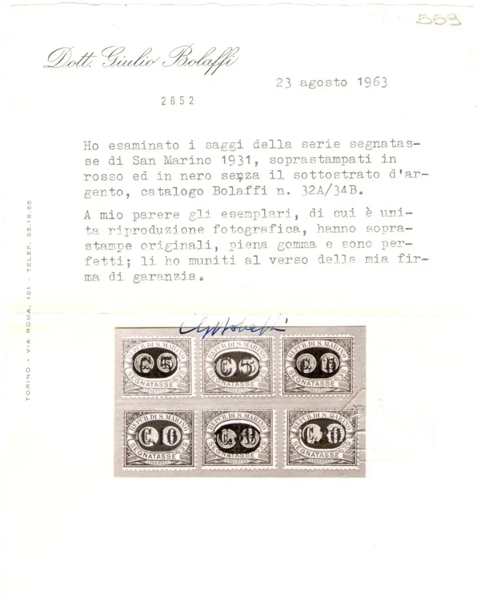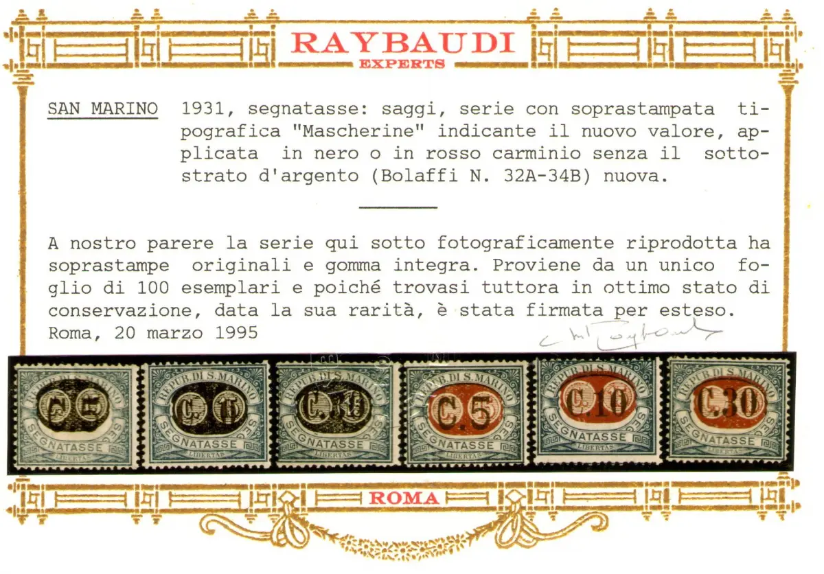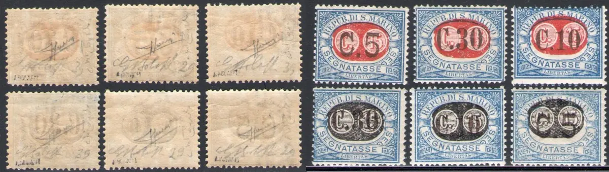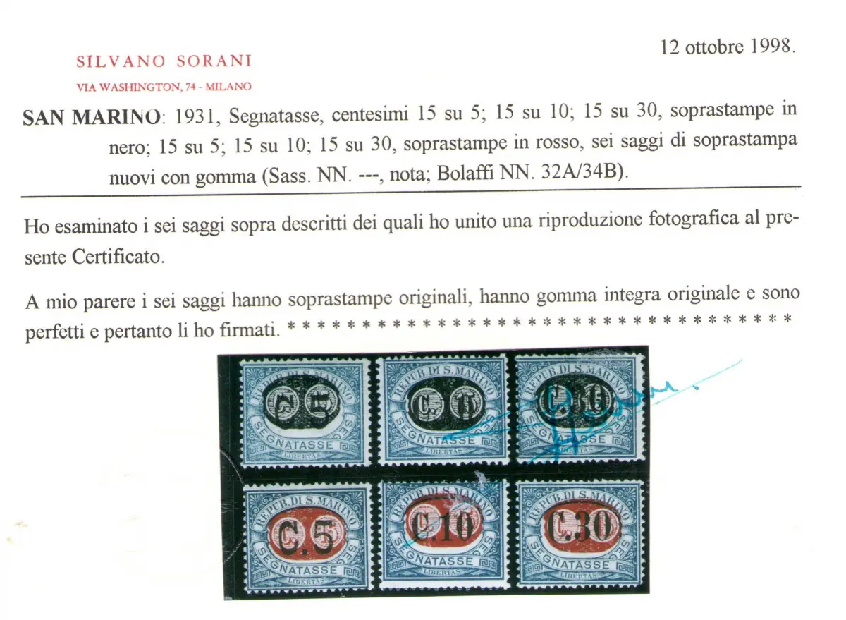 1931 SAN MARINO, Steuermarken - Essaggi - Schwarz-Rot-Aufdruck - Nr. 32A/34B - Selten - Bolaffi Zertifikate - Auflage 100 Serie SÄCHSISCHER KATALOG Euro 26500 - RSM 1