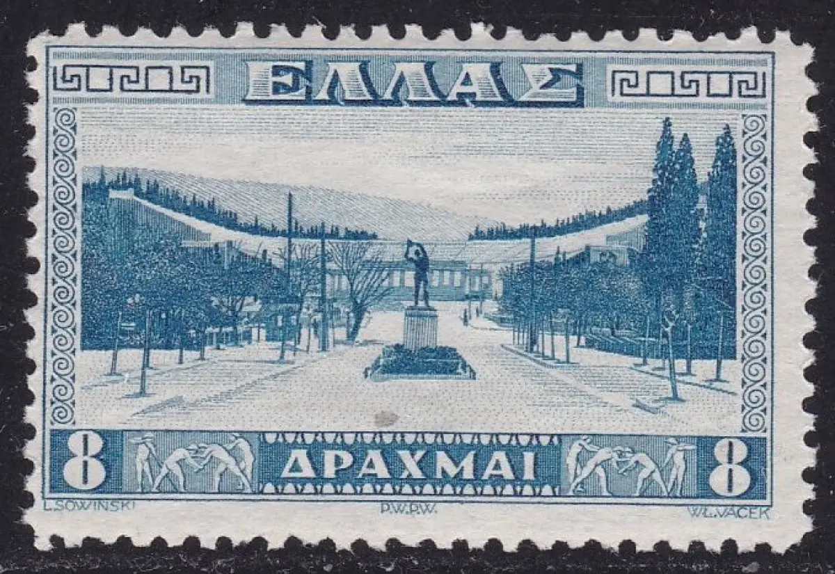 1934 GRIECHENLAND, Nr. 404 8d. hellblau MNH/** EINSCHLUSSSTELLE Stadion Athen Einheitskatalog Euro 200 A/M