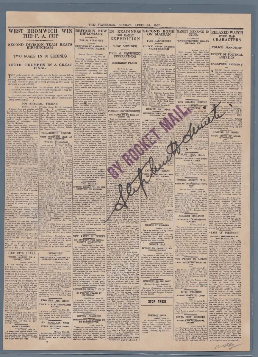 1934 INDIEN, Brief Rocket Mail von Kalkutta zur Station Semaphore - Saugor Island mit ZEITUNG INNEN Brief und Zeitung signiert vom Piloten Stewphen H. Smith, nur 220 geflogene Umschläge Stornierung der Lieferung in Kalkutta auf der Rückseite Lot 107
