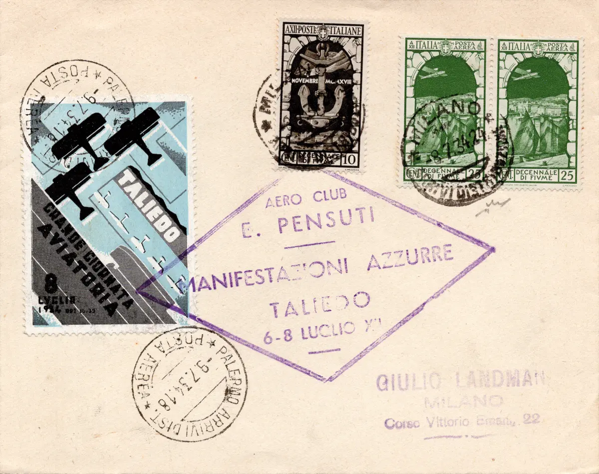 Umschlag - 1934 Taliedo Blaue Manifestation vom 8.7.34 - Umschlag des Aeroclub E. Pensuti frankiert mit gezackter Vignette, die am 9. Juli auf dem Luftweg nach Palermo geschickt wurde (Kat. Lang Nr. 3139) - Schön und ungewöhnlich auch für die Frankatur Cod. 161/17