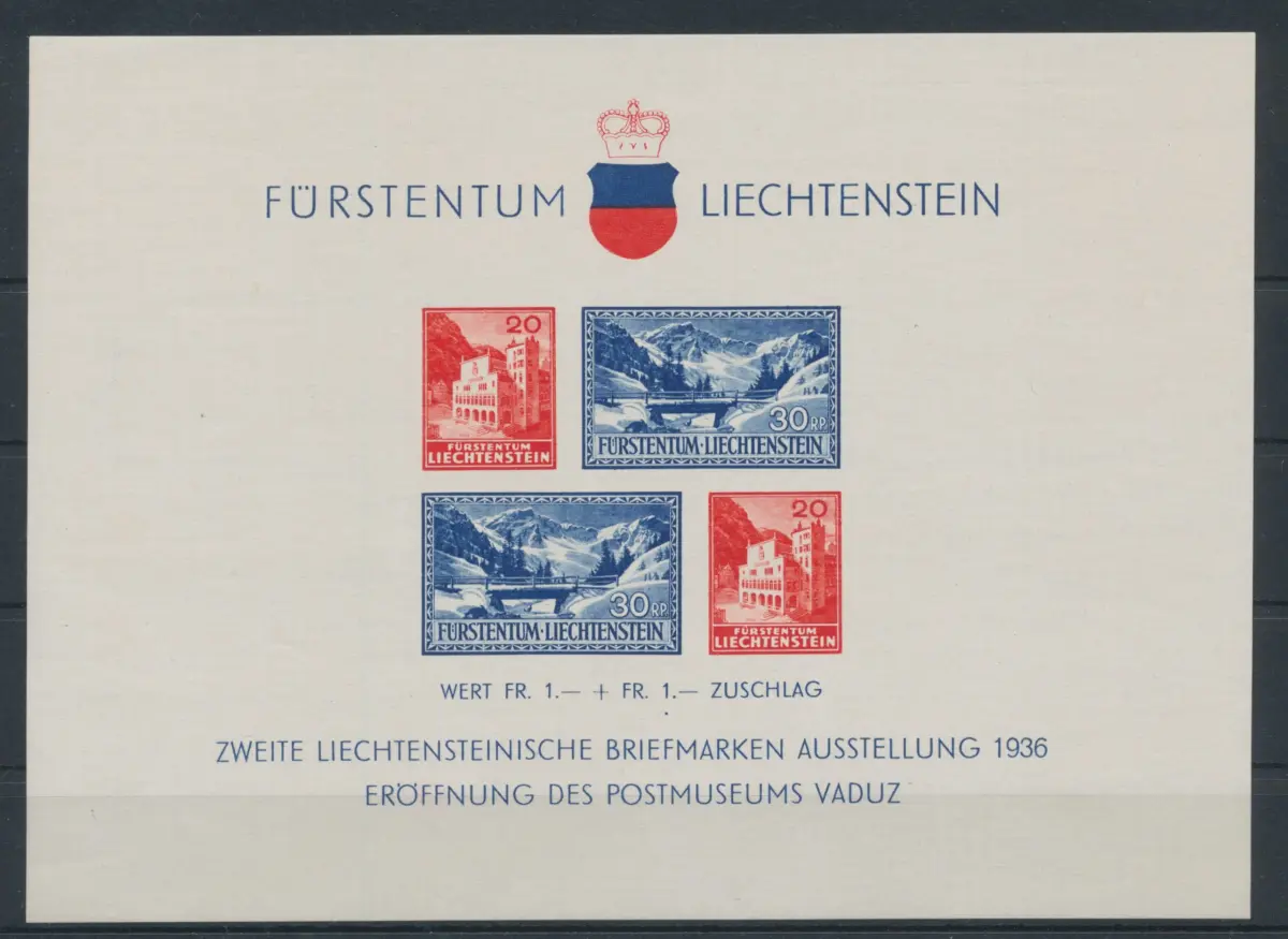 1936 Liechtenstein, Bf Nr. 2. Vaduz-Ausstellung und Eröffnung des Postmuseums NMH** Einheitskatalog Euro 90,00 Auslandskarton