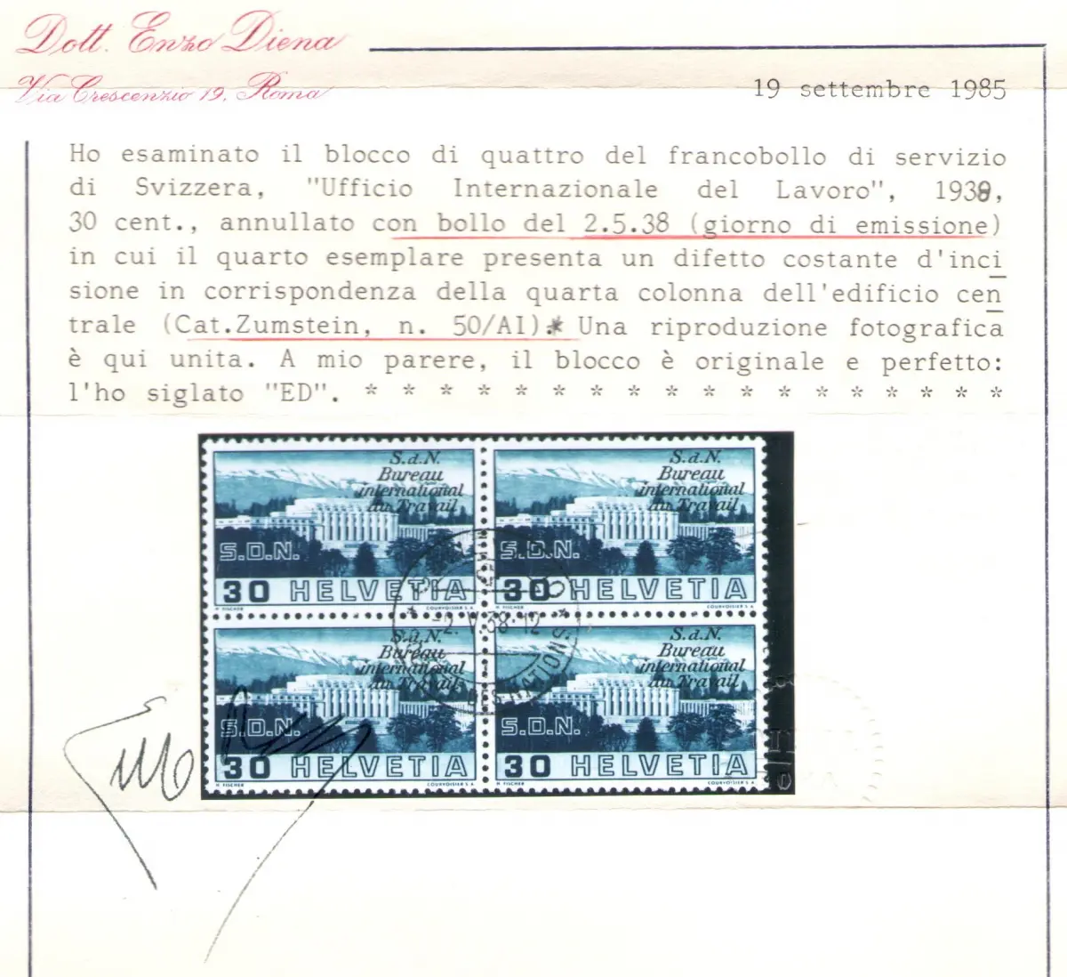 1938 SCHWEIZ, Sorte, 30 Cent. Kassettensäulen - gebrochene Säule - Zumstein Nr. 50/A1, Viertel gebraucht am ersten Ausgabetag!!!