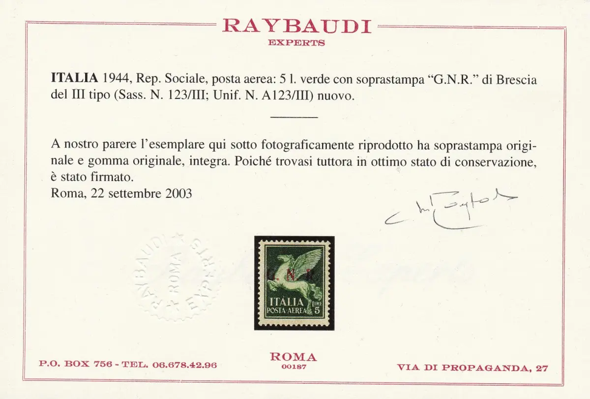 1943 Italienische Sozialrepublik, GNR Luftpost Nr. 123/III Brescia VOLLGUMMI Raybaudi Zertifikat Der Wert von 5 Lire grün mit Überdruck Brescia des dritten Typs Sächsischer Katalog Euro 2.400 Lot 81