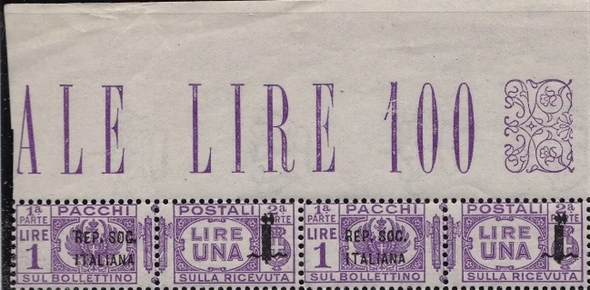 1944 Italienische Sozialrepublik, Postpaket Nr. 42 1 Lira lila MNH / ** Paar mit 36 mm Überdruck. + 39 mm. mit Bogenrand in hohem Typ von 1927-32 mit Aufdruck Sächsischer Katalog Euro 285 TOP & SEHR FRISCH Lot 83