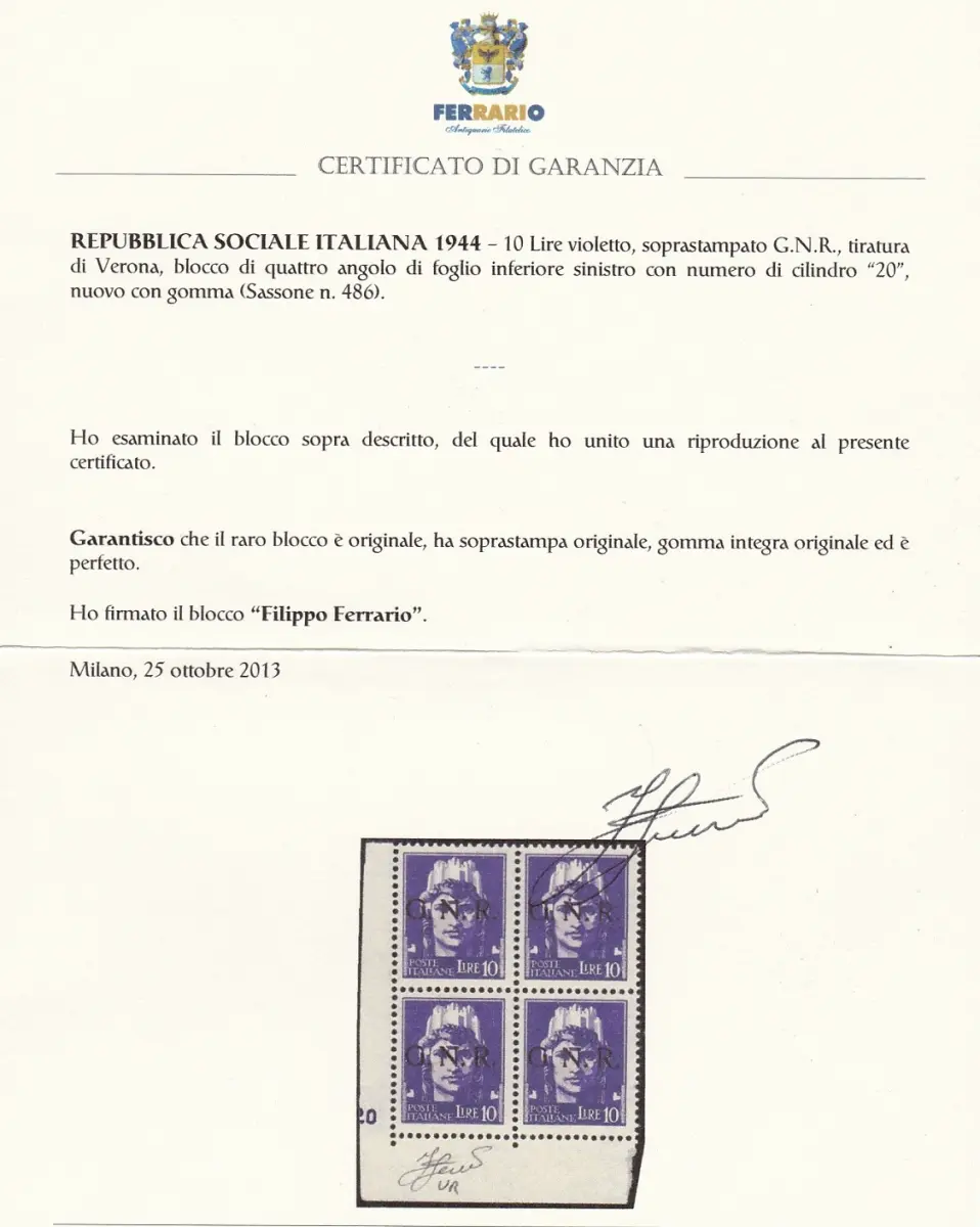 1944 Italienische Sozialrepublik, Nr. 486 10 Lire violett MNH / ** VIERTEL MIT TISCHNUMMER Signiert Olive Zertifikat Eisen SACHSEN Katalog Euro 2.400 + + Lot 83