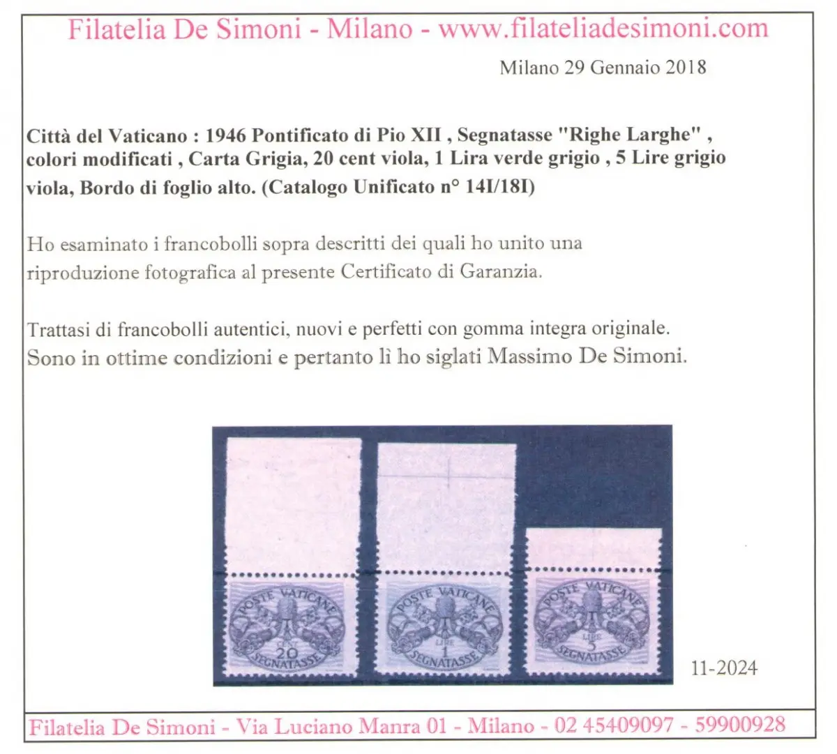 1946 Vatikan, Steuermarken breite Streifen graue Karte 3 Val, neu und einwandfrei, Bogenrand postfrisch **, Original Vollgummi mit Garantiezertifikat Philatelie De Simoni.