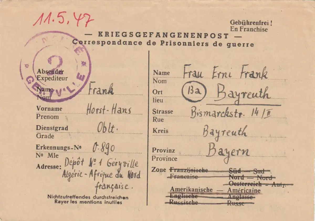 1947: POW, Kgf-Post, Algérie, Afrique du Nord à Bayreuth