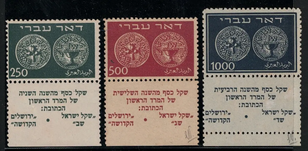 1948 ISRAEL, Alte Jüdische Münzen, mit Anhängen, #7/9, MNH** Extrem seltene Serie, sehr gute Qualität wie gescannt Blaue Box Lot DC Sammlermarken - Israelmarken - Seltene Briefmarken - Sammlermarken - Israel - Sammeln - Philatelie