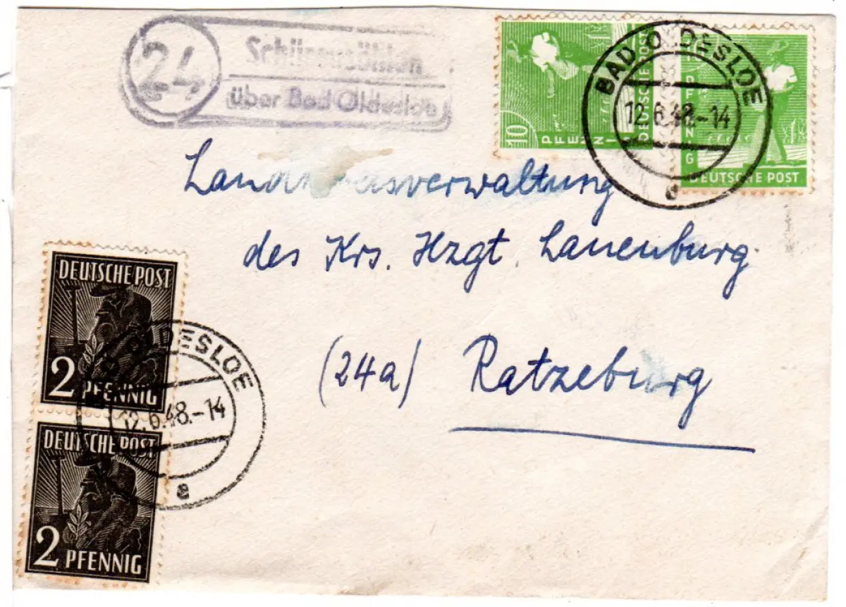 1948, Landpoststempel 24 SCHÜRENSÖHLEN über Bad Oldeslohe auf Brief m. 4 Marken