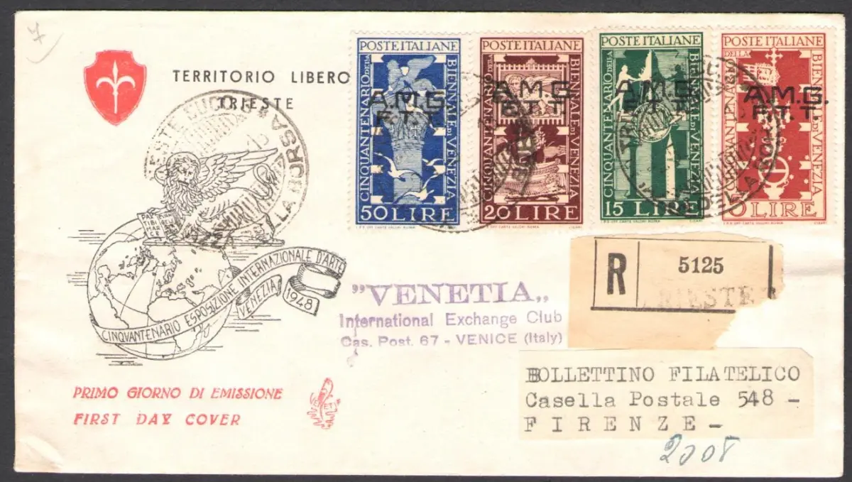 1949 TRIEST A - Biennale von Venedig auf venezianischem Umschlag Nr. 8 Einschreiben für Italien Sächsischer Katalog Euro 234 LOT 30 Box Umschläge Venedig Triest