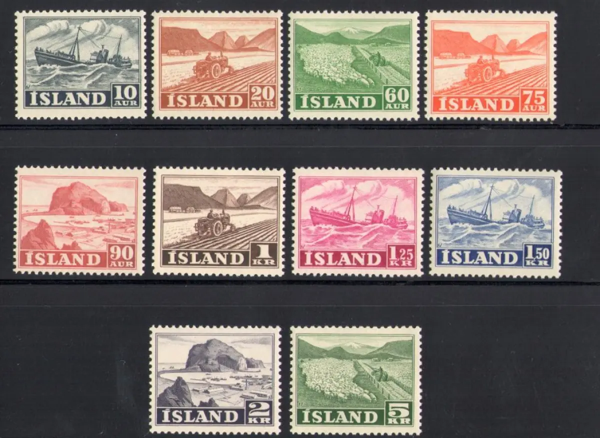 1950 Island, Nationale Aktivitäten, 10 Val Nr. 224-233 MNH ** (1,25 Kr. mit Druckaufkleber)