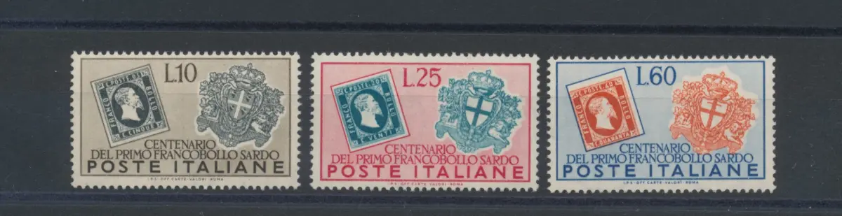 1951 Italien - Republik, Hundertjahrfeier der ersten sardischen Briefmarken, 3 Werte, Nr. 672/74, postfrisch ** Einheitlicher Katalog 2021 Euro 14