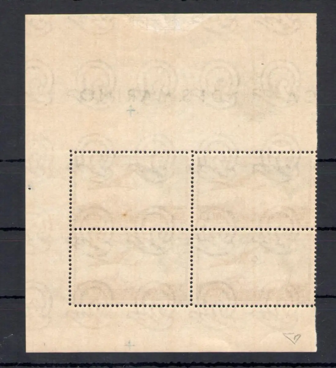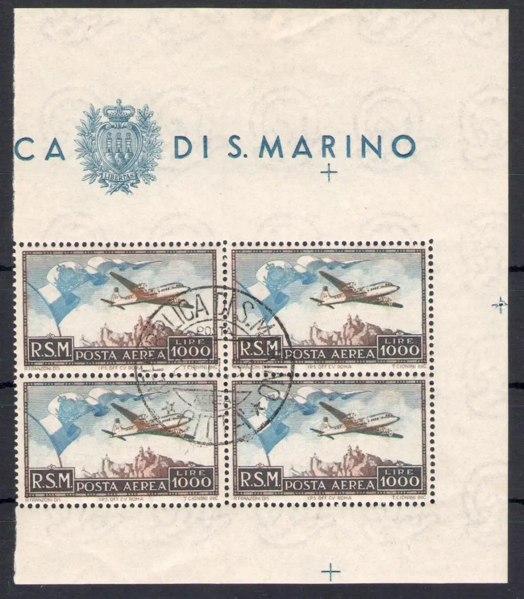 1951 SAN MARINO - Luftpost Nr. 99 1.000 Lire braun und himmlisch - Das seltene Viertel auf der Rückseite hat seinen Vollgummi und Originalgummi, gestempelt mit Stempel 28.11.1951 'Flagge' GEBRAUCHTES VIERTEL aus dem sächsischen Euro-Katalogbogen 3.000++++ SEHR SELTEN