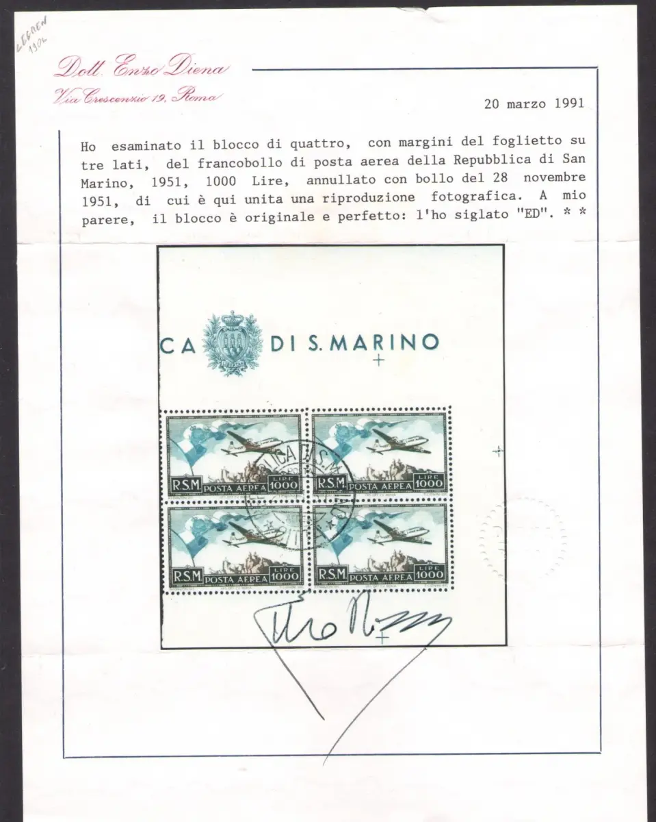 1951 SAN MARINO Luftpost 'Flagge' - Viererblock - 28.11.1951 - Sächsischer Katalog Nr. 99 - Zertifikat Enzo Diena Selten