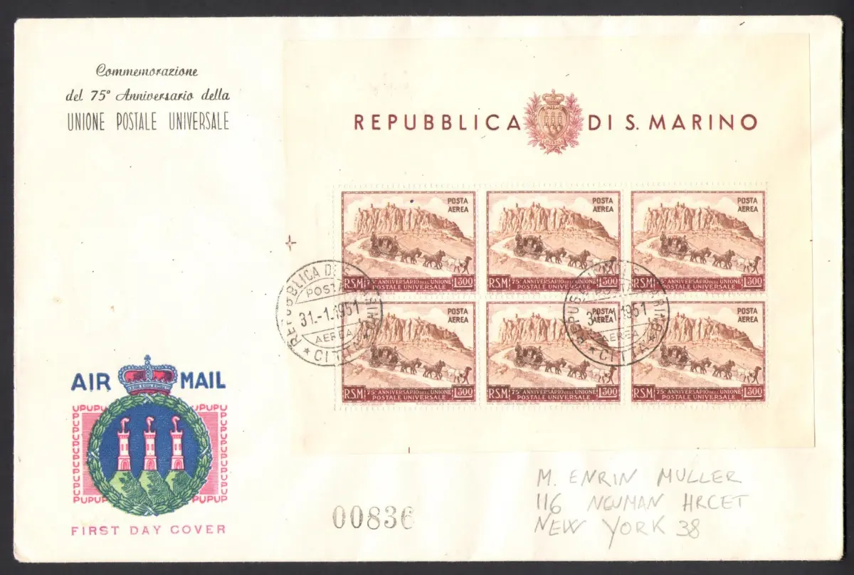 1951 San Marino, Ansichtsblatt Nr. 10, von San Marino nach New York - FDC - 231-01-1951, gereiste Luftpost mit Ankunftsstempel um 2-04-1951 Album bordeaux Hochregal Laden - Sächsischer Katalog 550+++ Hausliste für Umschlag Venedig Euro 780