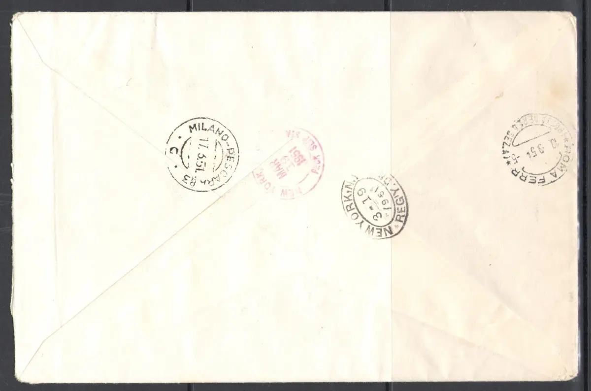 1951 San Marino, Ansichtsblatt Nr. 9, von San Marino nach New York - FDC - 15.03.1951, gereiste Luftpost mit Ankunftsstempel um 19.03.1951 - Transitmarken nach Mailand und dann Rom Album Bordeaux Hochregal Laden - Sächsischer Katalog 300 Hausliste für Umschlag Venedig 450 Euro