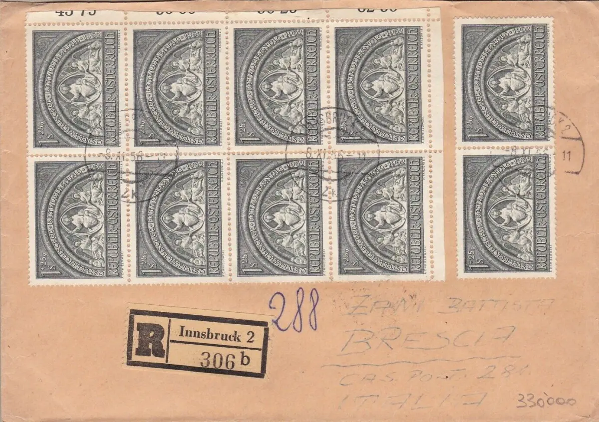 1952 ÖSTERREICH, Nr. 816 Block von 8, eingeschrieben von Innsbruck nach Brescia (Italien)