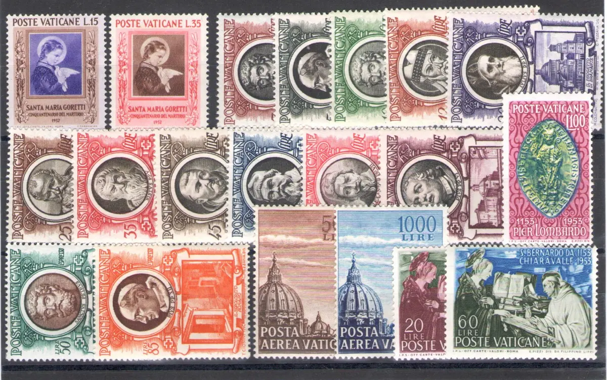 1953 Vatikan, postfrische Briefmarken, kompletter Jahrgang 22 Werte, 18 der Ordentlichen Post + 2 der Luftpost + 2 Espress postfrisch ** postfrisch - Vatikan - Sammlung - Philatelie - komplette Jahrgänge - Vatikanstadt