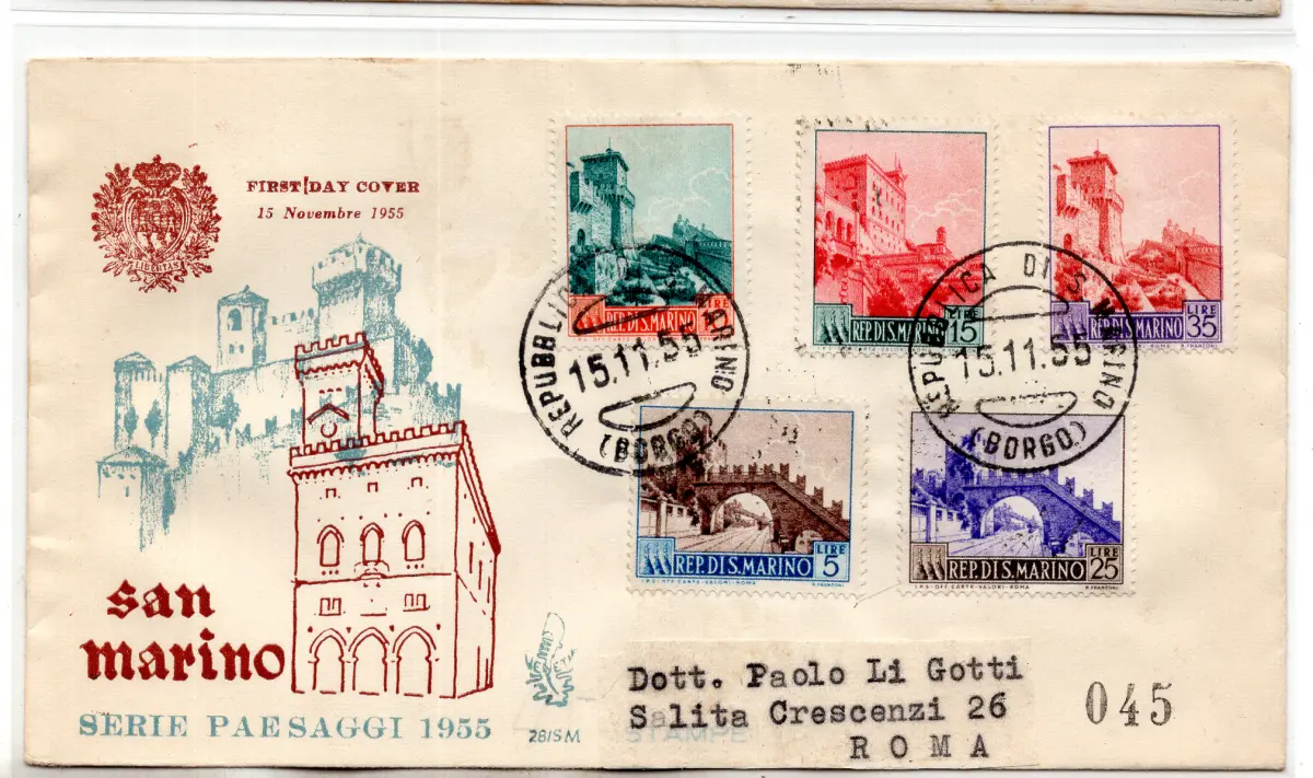Umschlag - - 1955 Ansicht Nr. 423/427 Serie auf Umschlag FDC Venetia Club gereist mit Ankunftsstornierung - perfekt Cod. 2643/WEB
