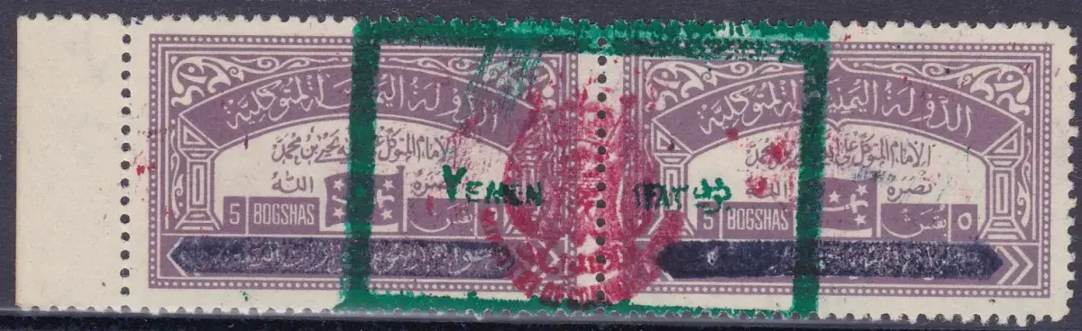 1964 JEMEN / Realistische Kriegsausgabe ausgestellt in Qara HORIZONTALES PAAR Konsularischer Handstempel auf einem Paar in grün mit dem Royal Arms Siegel des Kommunikationsministeriums in der Mitte MNH / ** Stanley Gibbons L 1.600 A/M Lot 98
