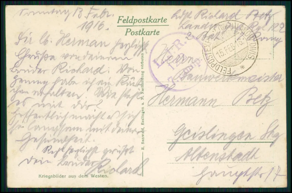 1.WK Landwehr inf. Rgt. 122 - Soldat R. Betz- Feldpost Feb. 1916 - Dorf Véry Fr.