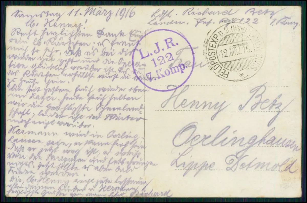1.WK Landwehr inf. Rgt. 122 Soldat R. Betz Feldpost März 1916 Ardennes Grand Est