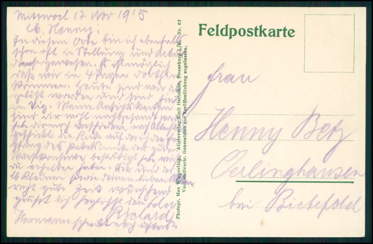 Originale Feldpost Karte stammt von Richard Betz, einem Angehörigen des Württembergische Landwehr-Infanterie-Regiment Nr. 122  innerhalb einer Fernsprechtruppe im Ersten Weltkrieg