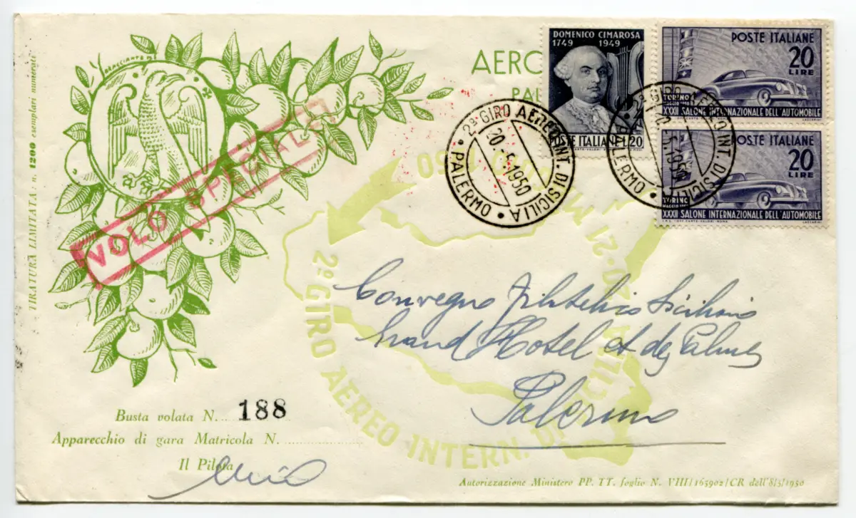 2. Giro Aereo di Sicilia - Aerogramma da Palermo - 2. Giro Aereo di Sicilia - Aerogramm von Palermo nach Palermo frankiert mit Nr. 615 + Paar der Nr. 616 - auf der Rückseite Ann. Etappe Catania - Ann. Flugspezialitäten und Pilotenunterschrift Code 489/3