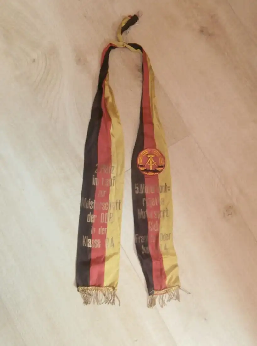 große Siegerschleife : 2. Platz DDR-Meisterschaft , Juni 1974 , Frankfurt a. Oder , Motorbootrennen , Motorboot , ADMV , Rennboot !!HeHa2