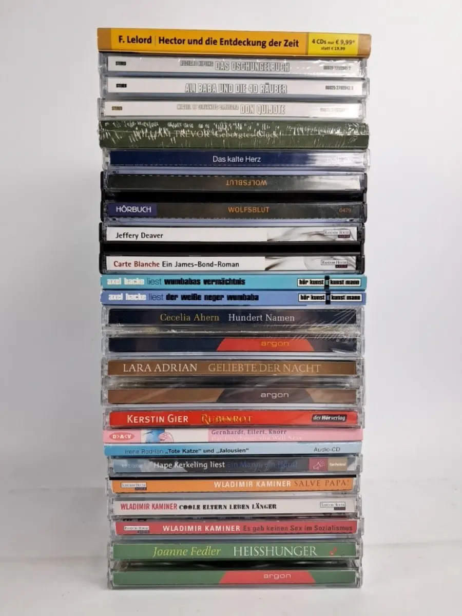 Bemerkungen: Zustand: Hüllen teils leicht berieben, einige original eingeschweißt. Eine Titel-Auswahl nicht möglich, die Sammlung ist so erwerbbar wie angeboten. Das Konvolut enthält die Titel: Hector und die Entdeckung der Zeit - François Lelord, Ali Baba und die 40 Räuber - erzählt von Judy Winter, Das Dschungelbuch - Rudyard Kipling, Don Quijote - Miguel de Cervantes, Geborgenes Glück - William Trevor, Das kalte Herz - Wilhelm Hauff, Wumbabas Vermächtnis - Axel Hacke, Der weiße Neger Wumbaba - Axel Hacke, Das Ungeheuer von Well Ness - Robert Gerstmeier, Bernd Eilert, Peter Knorr, Rubinrot - Kerstin Gier, Wolfsblut - Jack London, Carte Blanche - Jeffery Deaver, Hundert Namen - Cecelia Ahern, Geliebte der Nacht - Lara Adrian, Heißhunger - Joanne Fedler, Coole Eltern leben länger - Wladimir Kaminer, Es gab keinen Sex im Sozialismus - Wladimir Kaminer, Salve Papa! - Wladimir Kaminer, Ein Mann, ein Fjord! - Hape Kerkeling, Maigret und sein Revolver - Georges Simenon, gelesen von Sabine Postel.