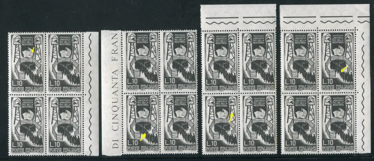 Zwanzig Jahre Widerstand Lire 10 - 4 verschiedene Sorten Vollgummi - Vier verschiedene Sorten der Viertelübertragung - Position 10 II Tafel Weißpunkt auf Soldaten + Position 13 der II Mastenplatte gebrochen + Position 31 der II Tafel Weißpunkt auf 6. Soldat + Position 29 IV Tisch Dunkeles Dreieck in der Flagge - Mittelmäßige Qualität aber Vollgummi - Interessantes zusammen für den Spezialisten - Code 1110/OUTLET