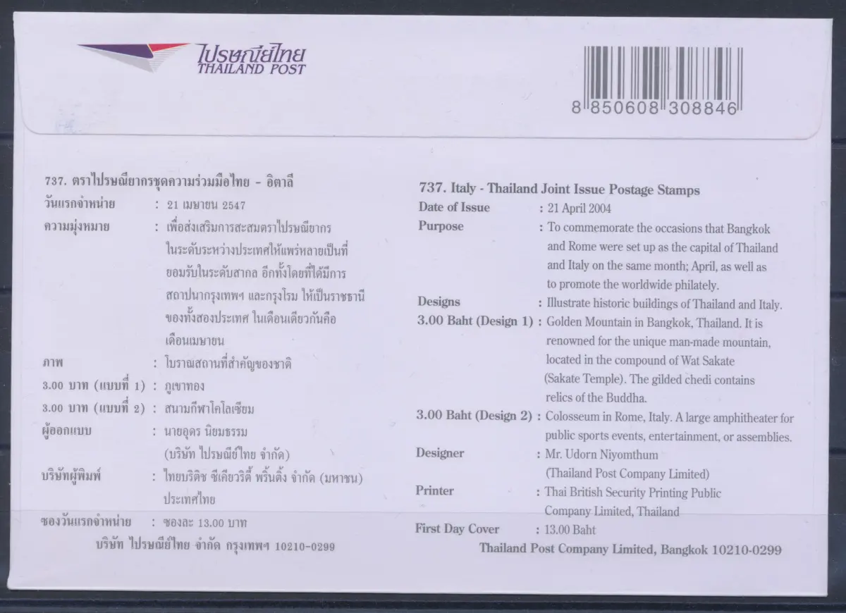 2004 Thailand Stiftung Rom - Bangkok Gemeinschaftsausgabe - 1 Paar auf offiziellem Umschlag, 21.04.2004 Offizielle Annullierung