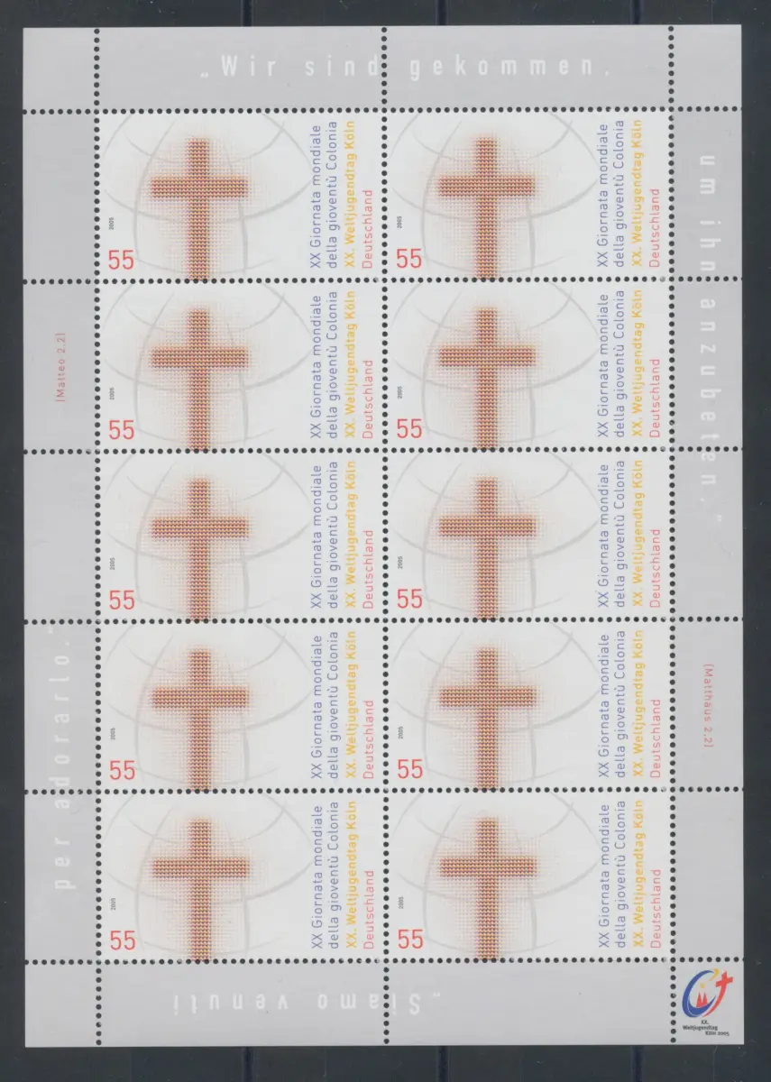 2005 Deutschland, Weltjugendtag, 1 Kleinbogen mit 10 Werten, Gemeinschaftsausgabe mit 1387 Vatikan - postfrisch ** Einheitskatalog Nr. 1387 Euro 25