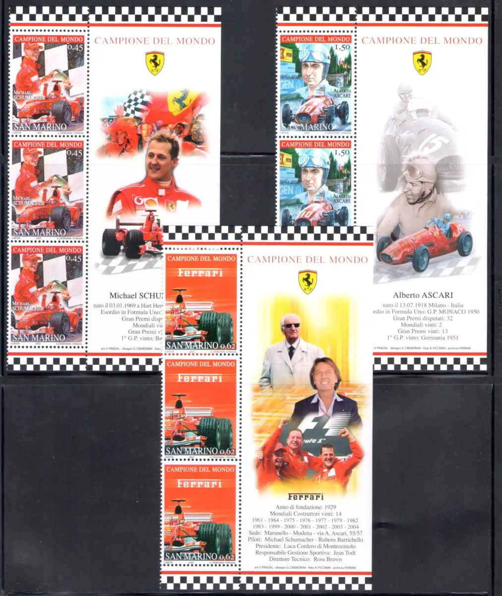 2005 San Marino, Hommage an Ferrari, Piloten Weltmeister mit Ferrari, Nr. 2025/2030, 6 Werte mit Beschreibung - postfrisch**