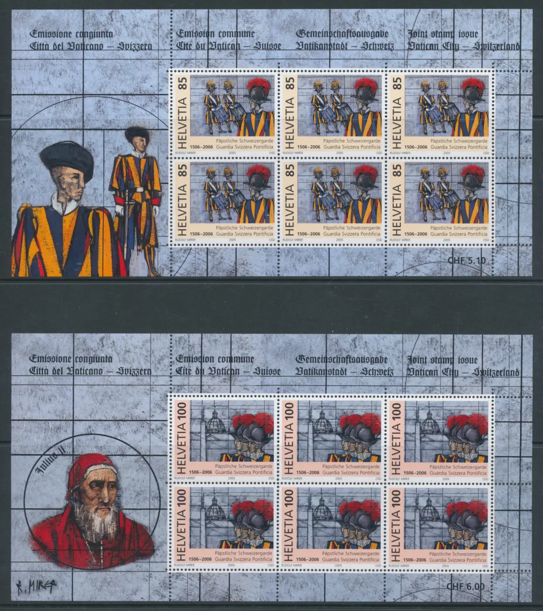 2005 Schweiz - Päpstliche Schweizergarde - Gemeinsame Ausgabe mit Vatikan Nr. BF 37/38 - MNH** - Komplette Kleinblätter mit 6 Werten - Hausmappe