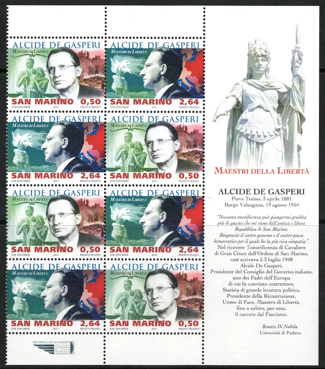2011 San Marino, Figurenblock Alcide De Gasperi # S.32 - MNH ** Katalog Eckblöcke Nr. 32 Euro 55 - Ordner San Marino 2011 postfrisch - Vatikan - Sammler - Philatelie - komplette Jahrgänge - Vatikanstadt