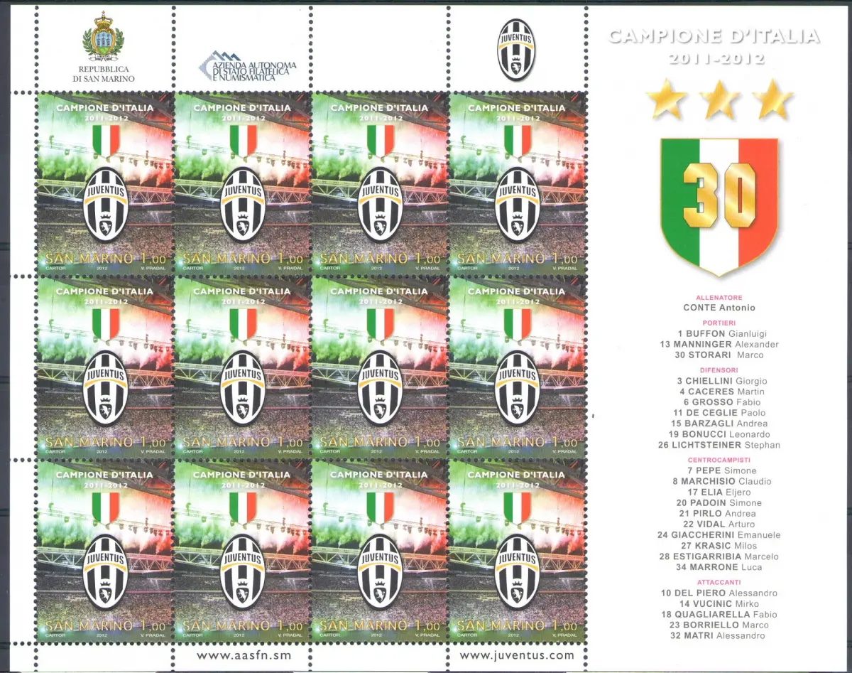2012 San Marino Juventus Campione d'Italia 2011-2012 Minifoglio 12 v MNH**, es handelt sich um neue und perfekte Briefmarken, wie sie von der Republik San Marino ausgegeben wurden, Auflage 5833 Kleinblätter.