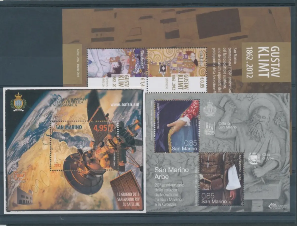 2012 San Marino Kompletter Jahrgang, Briefmarken, 19 Werte + 6 Zettel - MNH ** Philatelie - neue Briefmarken - Republik San Marino - Sammeln - seltene Briefmarken - Zettel - San Marino ist ein gebirgiger Mikrostaat innerhalb italienischen Territoriums, im zentralen-nördlichen Bereich des Landes. San Marino, eine der ältesten Republiken der Welt, hat einen Großteil seiner alten Architektur bewahrt. Die gleichnamige Hauptstadt liegt an den Hängen des Monte Titan und ist bekannt für die mittelalterliche Altstadt, die von Mauern umgeben ist, und die gepflasterten Gassen. Auf den drei Gipfeln des Berges erheben sich die drei Türme, Festungen aus dem 11. Jahrhundert.