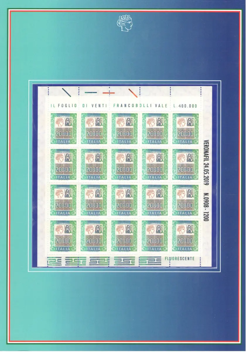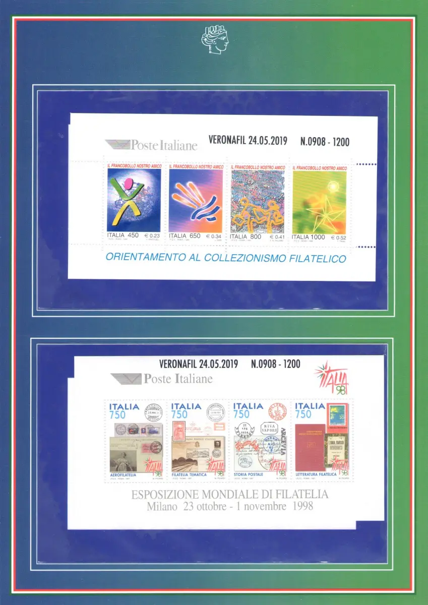 Alle Zettel und der Kleinbogen tragen an den Rändern den Aufdruck Veronaphil 24-05-2019 n 0000 von 1200 - Es kann sein, dass Sie den gescannten Ordner Nr. 0908 von 1200 nicht erhalten, aber Sie erhalten einen identischen, neuen und perfekten Ordner mit einer anderen Nummer.
