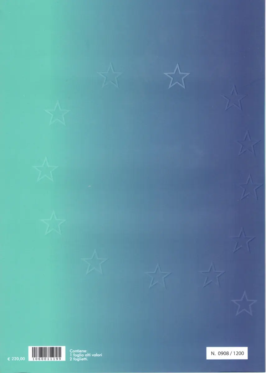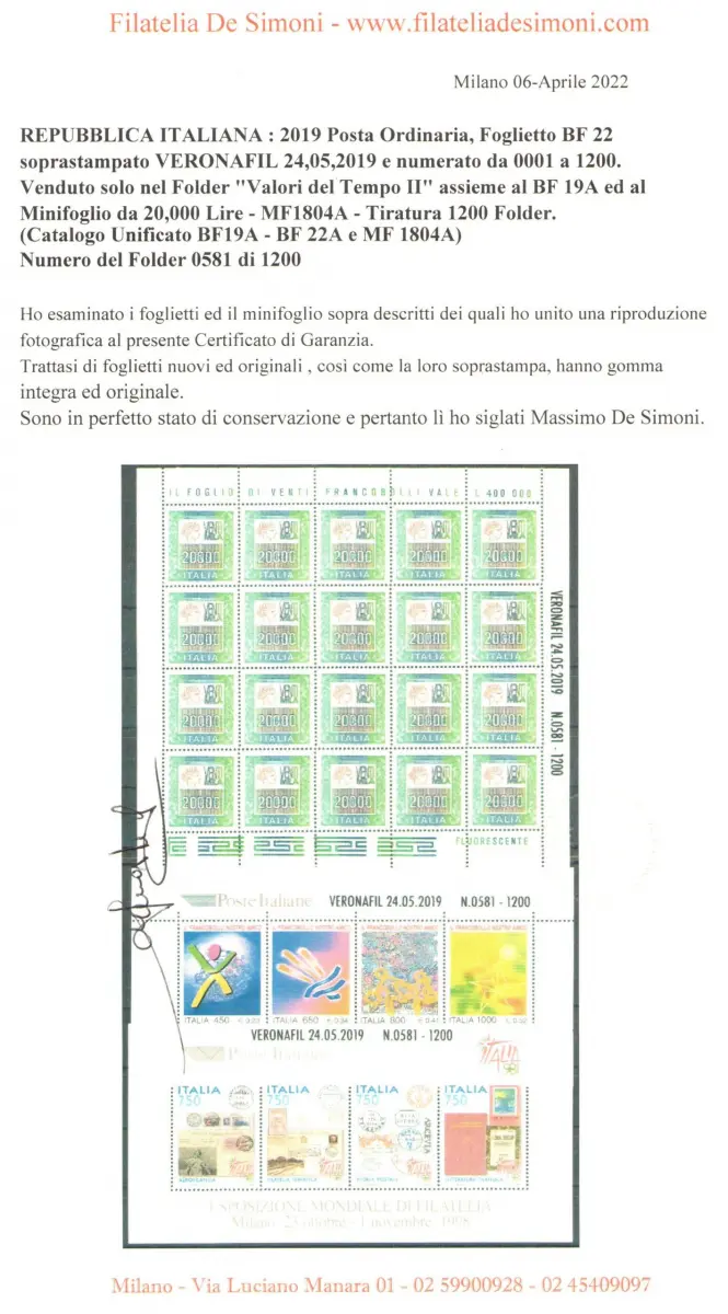 Der Ordner enthält, wie auf dem Scannen aller Seiten zu sehen ist, den 20-fachen Minibogen von 20.000 Lire MF1804A, den BF19A-Bogen und den BF22A-Bogen.