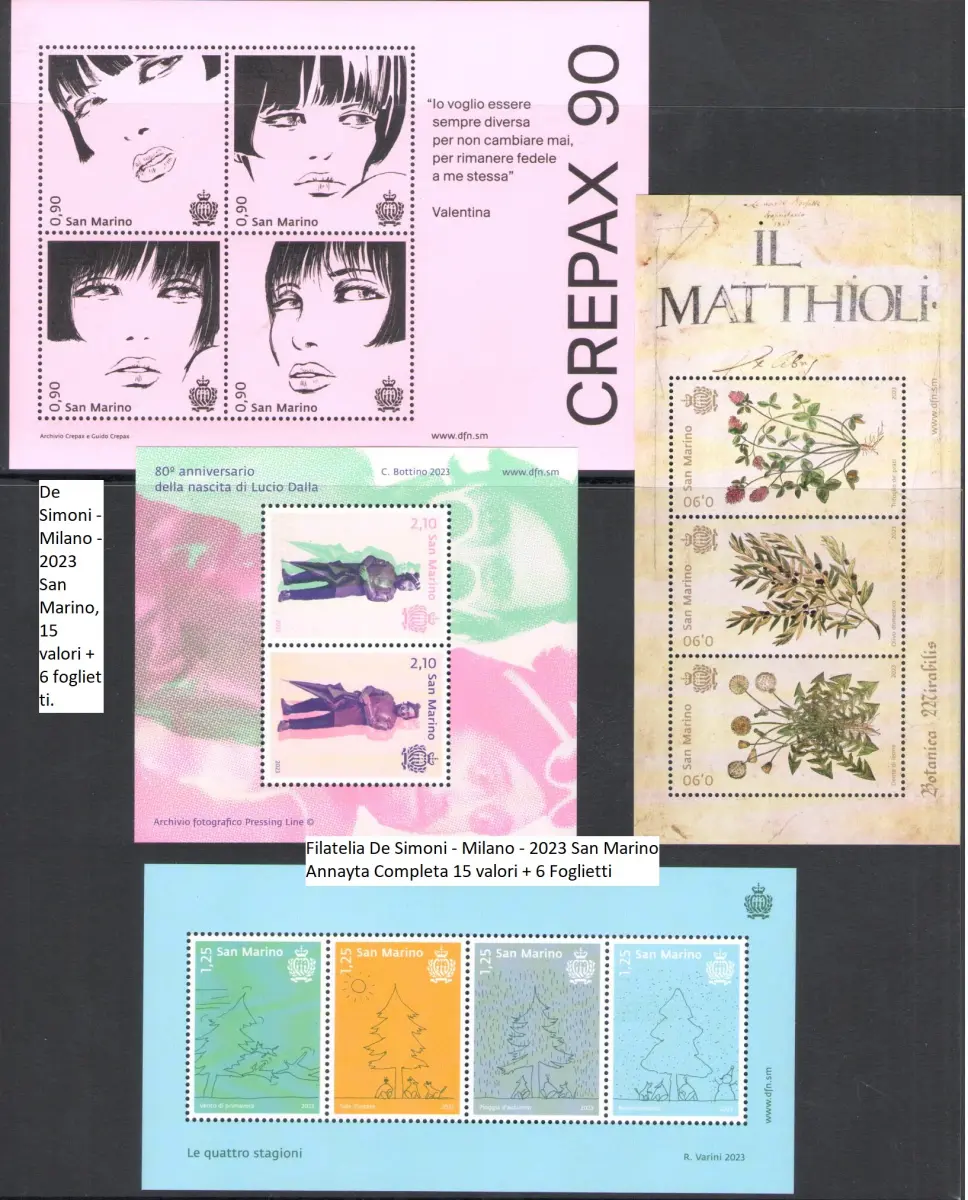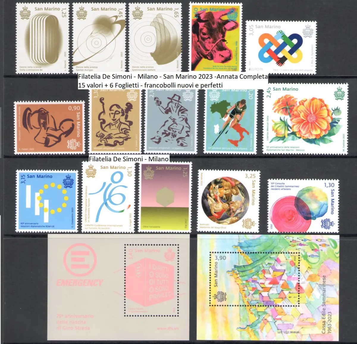 2023 San Marino, kompletter Jahrgang, 15 Werte + 6 Zettel - postfrisch ** Es handelt sich um alle von der Republik San Marino ausgegebenen Briefmarken und Zettel für das Kalenderjahr 2023, neu und einwandfrei mit Vollgummi und Original.