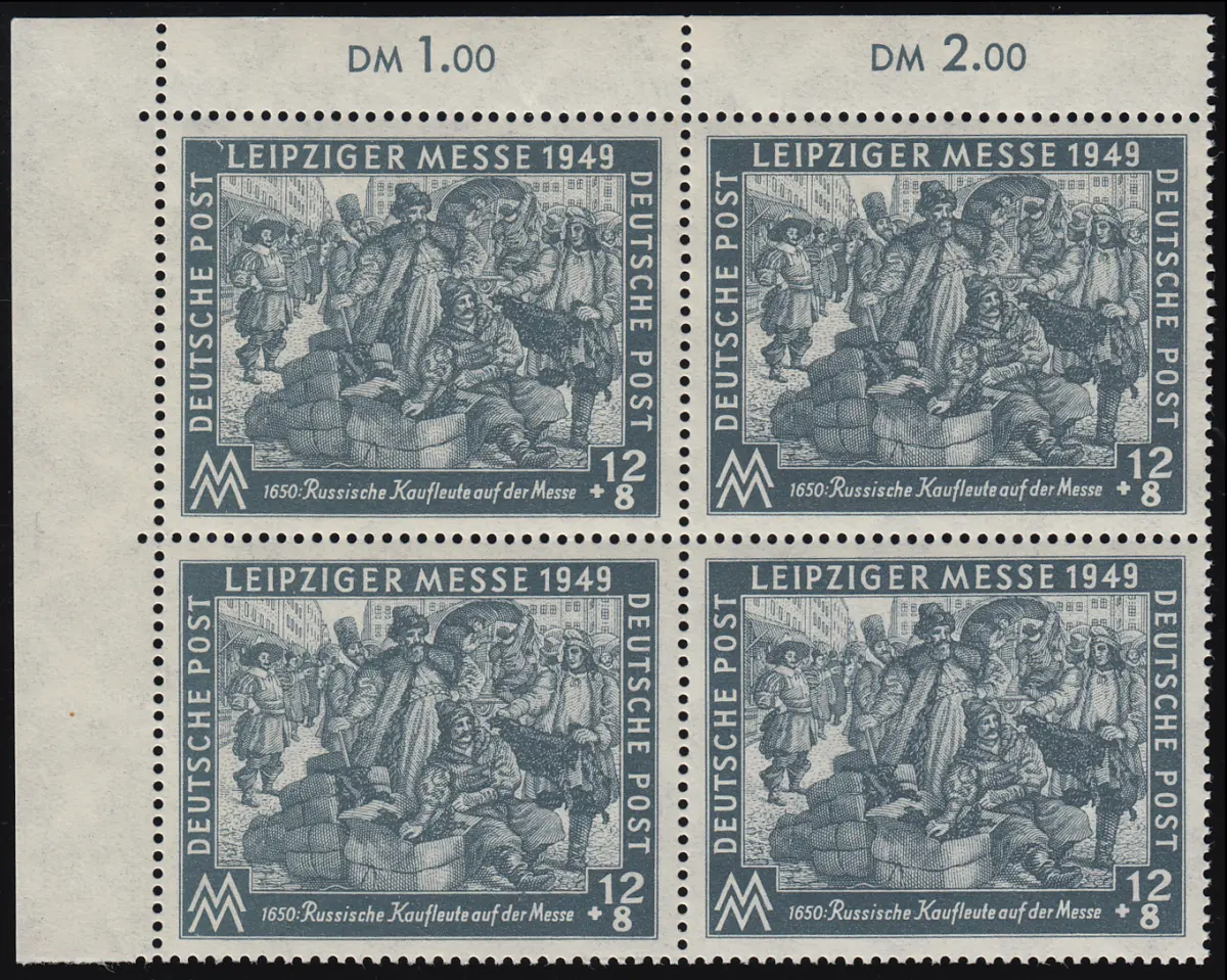 Postfrischer ungefalteter Eckrand-Viererblock oben links mit Plattenfehler I auf Feld 1 Rock des stehenden Mannes links mit Uhrzeiger.