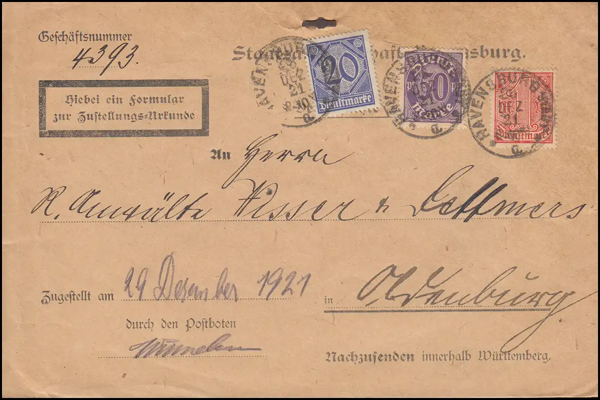 26+29+30 timbres de service sur l'instrument de signification RAVENSBURG 28.12.21 vers Oldenburg