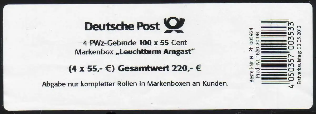 2935 phare Arngast - Banderole pour 4x100 timbres, Type I avec numéro de commande