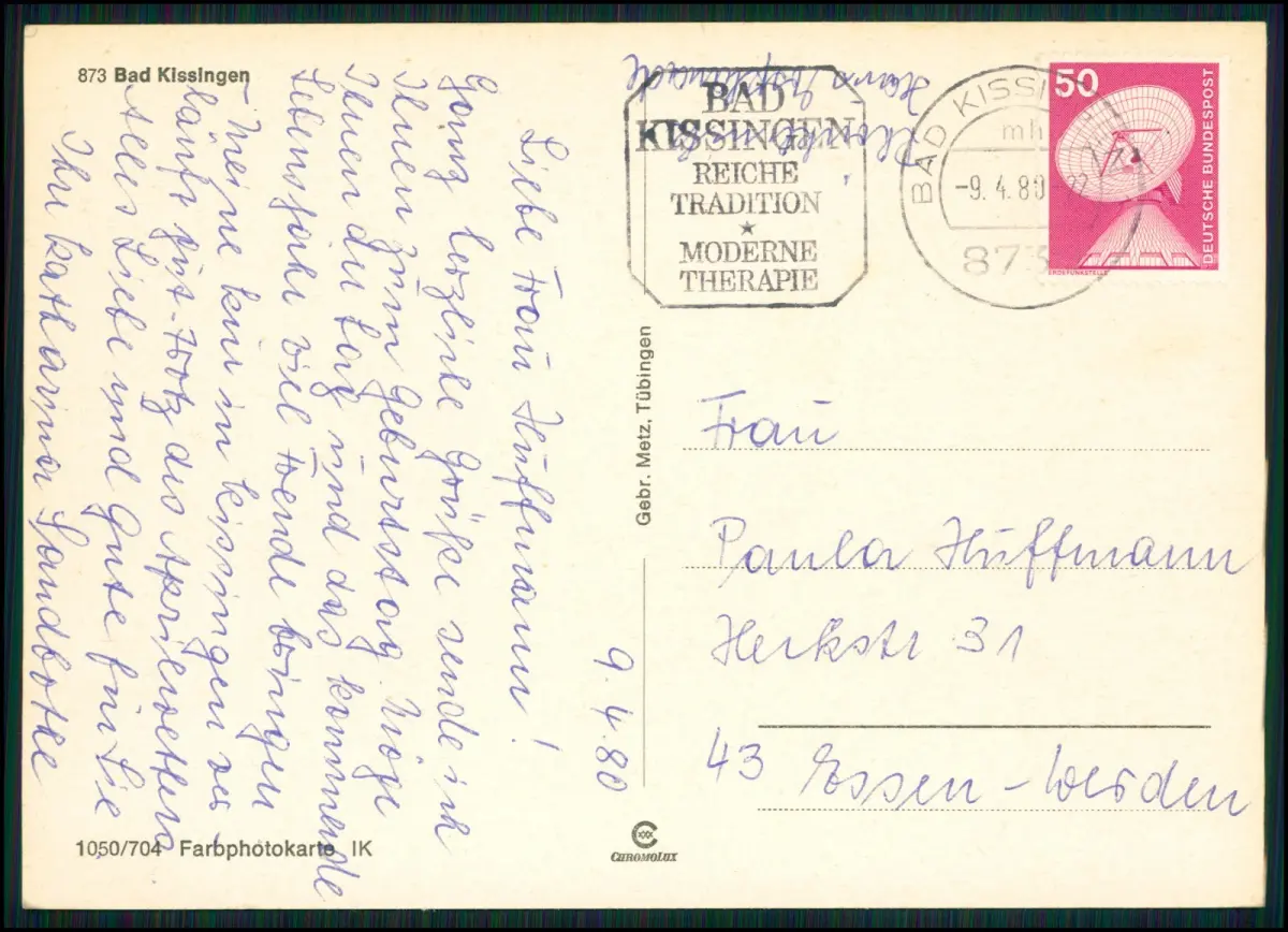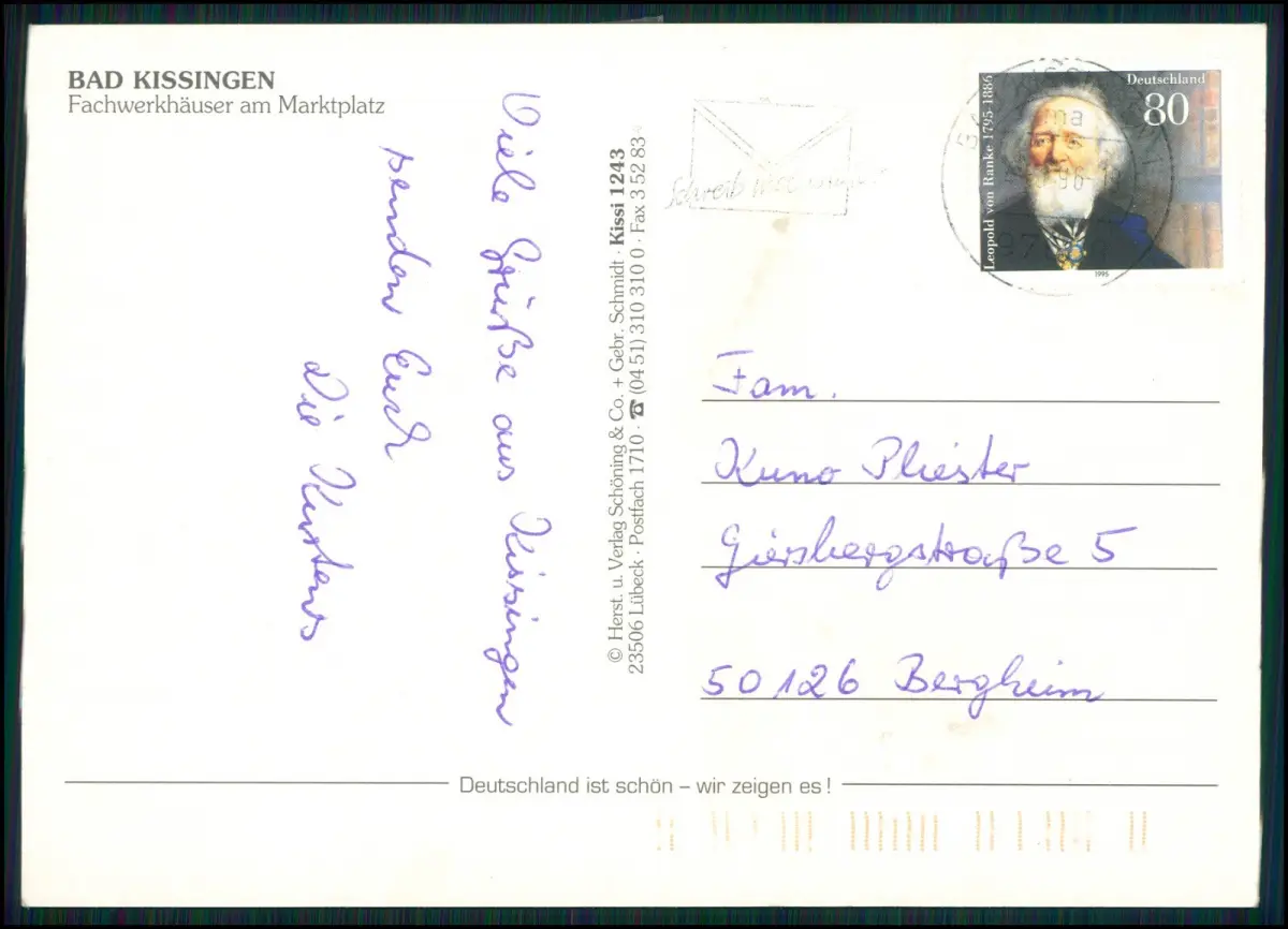 Verlag: Schöning & Co., Lübeck, Karte: Kissi 1243, frankiert mit 80 Pfennig „Leopold von Ranke“ (Bund MiNr. 1804), gelaufen, handschriftlich beschrieben.