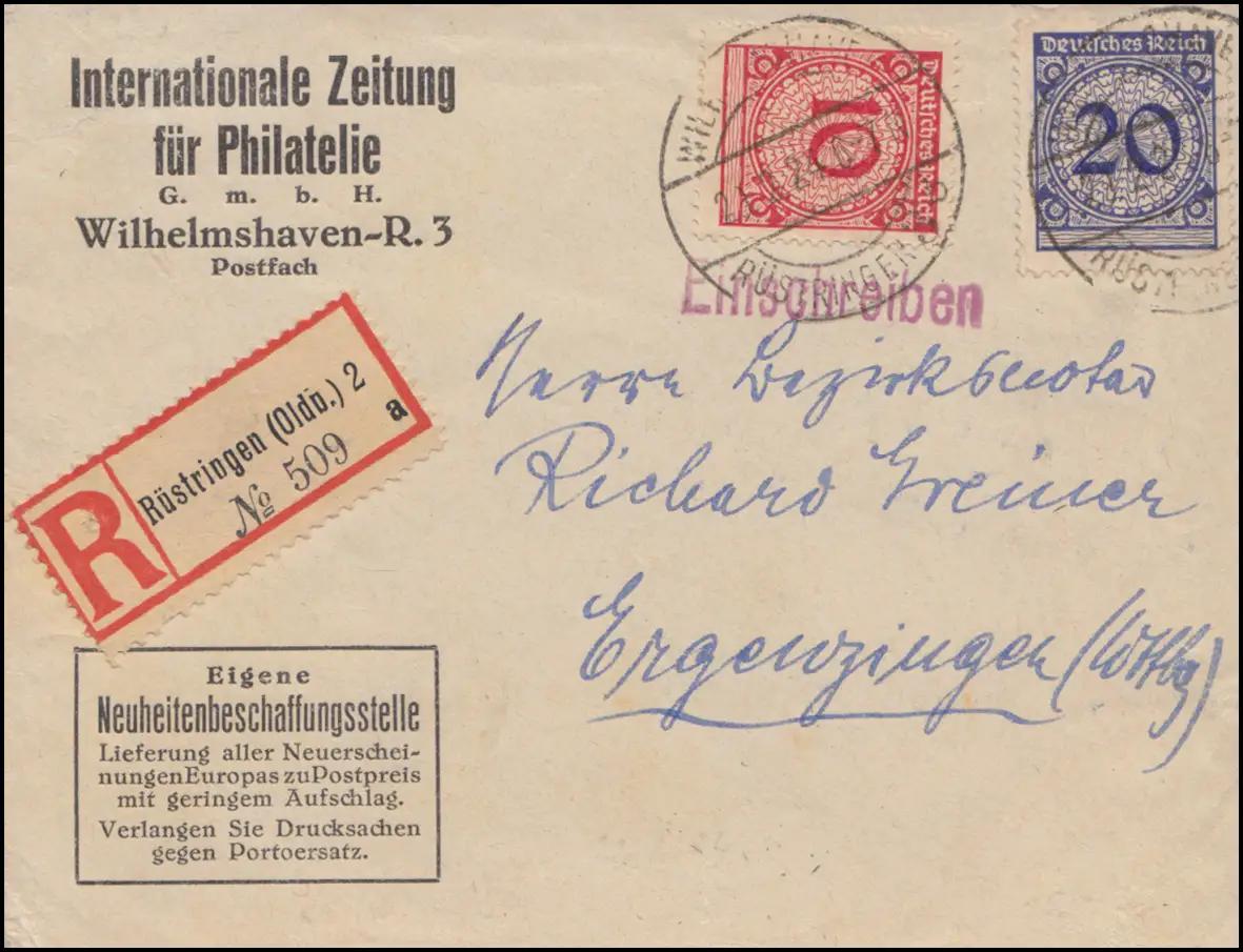 mit Einschreibe-Zettel Rüstringen (Oldb.) 2 von der Internationalen Zeitung für Philatleie GmbH nach Ergenzingen