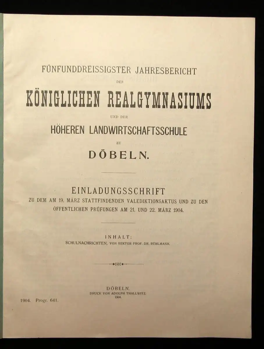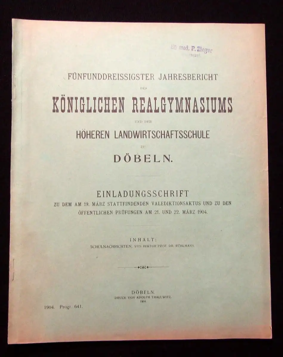 Einladungsschrift zu dem am 19. März stattfindenden Valediktionsaktus und zu den öffentlichen Prüfungen am 21. und 22. März 1904.
