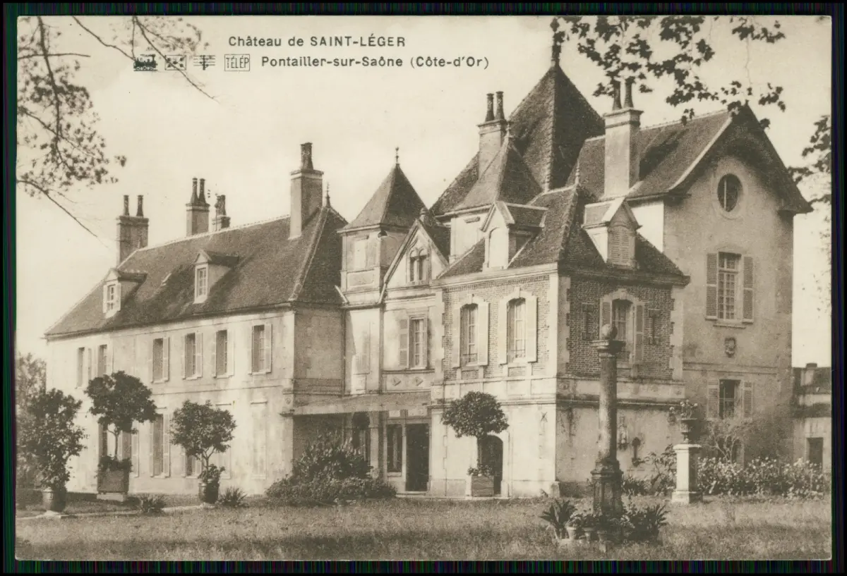 Seltene Serie mit drei Ansichten des Château de Saint-Léger, eindrucksvoll gelegen in einem bewaldeten Park am Ortsrand von Pontailler-sur-Saône im Département Côte-d’Or. Die Karten zeigen unterschiedliche Perspektiven des historischen Herrenhauses mit Nebengebäuden und Zufahrtswegen.
